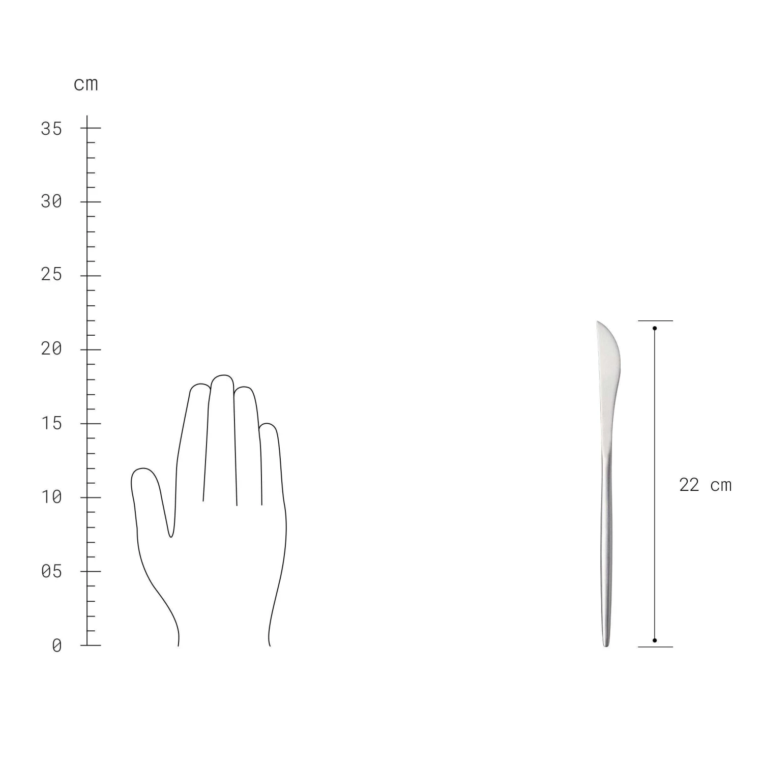 Messer: Länge 22 cm, Gabel: Länge 22,5 cm, Löffel: Länge 21,5 cm, Teelöffel: Länge 13 cm