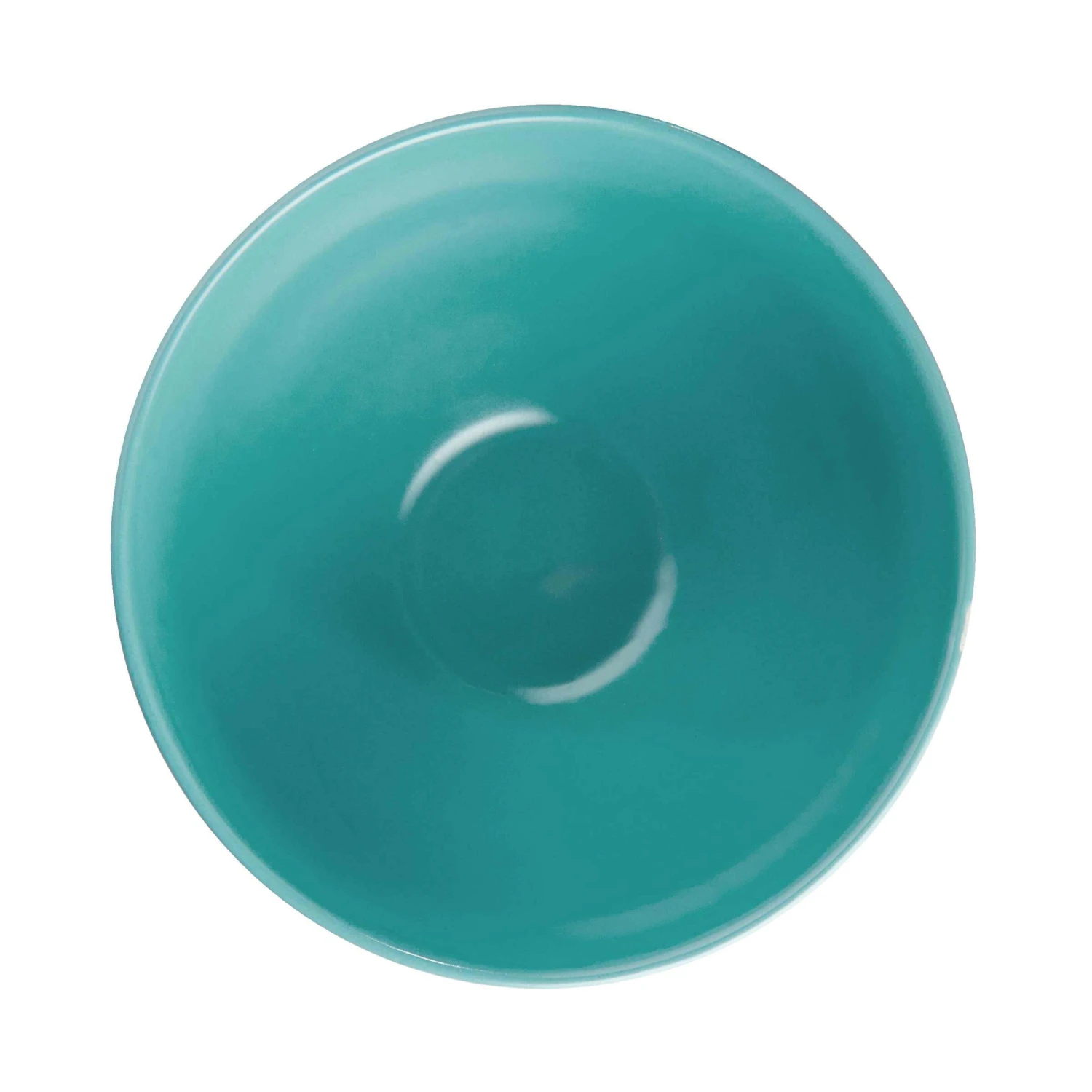 Jedes Teil des 12-teiligen Geschirrsets aus Steinzeug, bestehend aus Speisetellern, kleinen Tellern und Suppenschalen, die effektvoll glänzende Glasur in exotischen Farben (innen eher matt) unterstreicht die kostbare Optik. Was für ein sanfter Kontrast zu den sehr scharf gewürzten Speisen, die man in Padang und ganz Sumatra traditionell reicht.